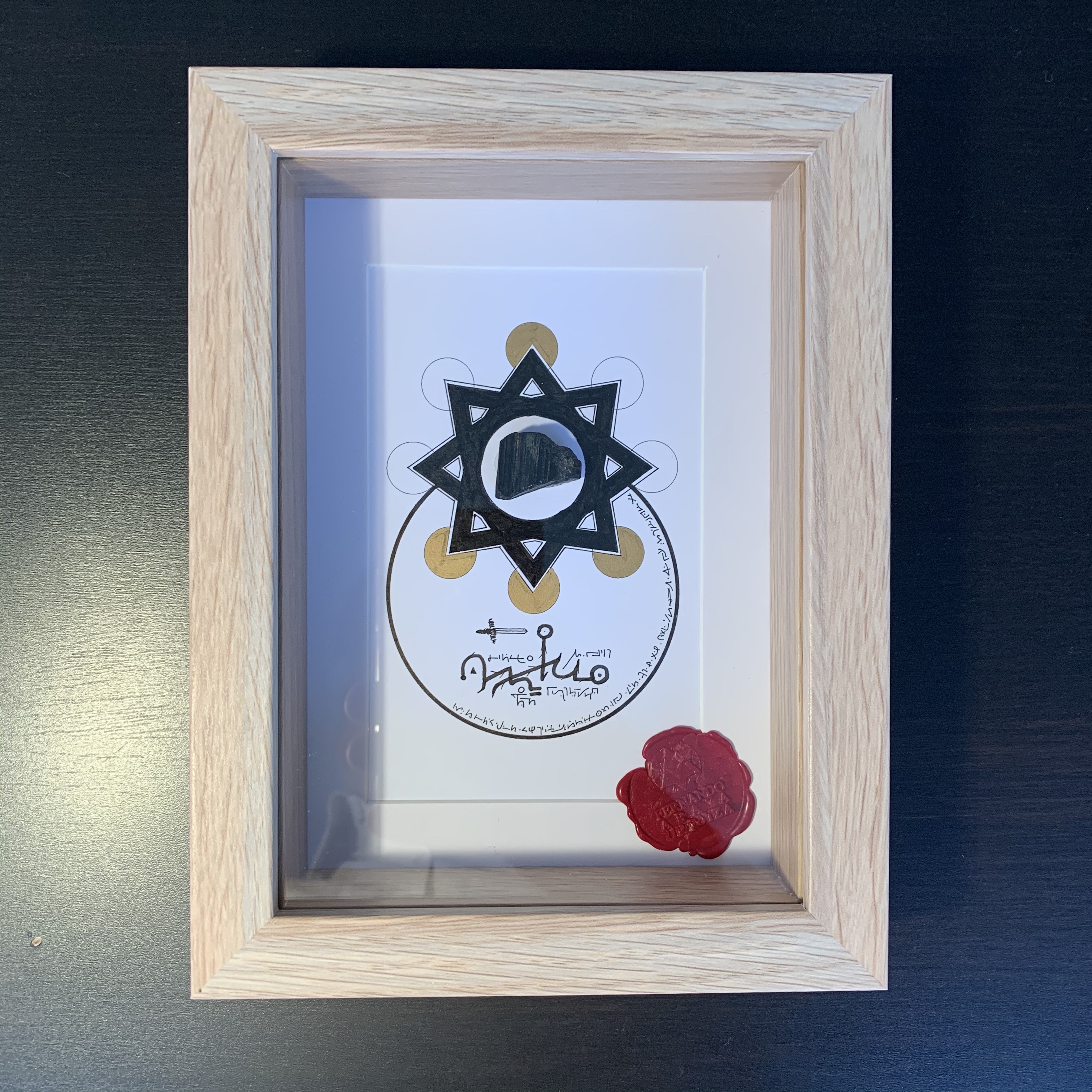 Este Talismán devuelve la confianza ante toda duda y cansancio, toda barrera y rivalidad, toda energía perversa de malas intenciones. Su dibujo y su piedra de Turmalina Negra absorve y diluye aquella intención de oposición creada con mala intención para caer en el engaño y la falsedad. Este talismán devuelve esa intuición de lo certero y la vitalidad. Ideal para desafíos mayores. Características: Tamaño del área del dibujo: 12cms. x 12cms. Enmarcación provisoria tamaño 25,5cms. x 25,5cms. Dibujo a Tinta de 12cms x 12 cms con Cristal Turmalina Negra. Origen Ica, Perú Activado en altar. Incluye envío por correo normal.