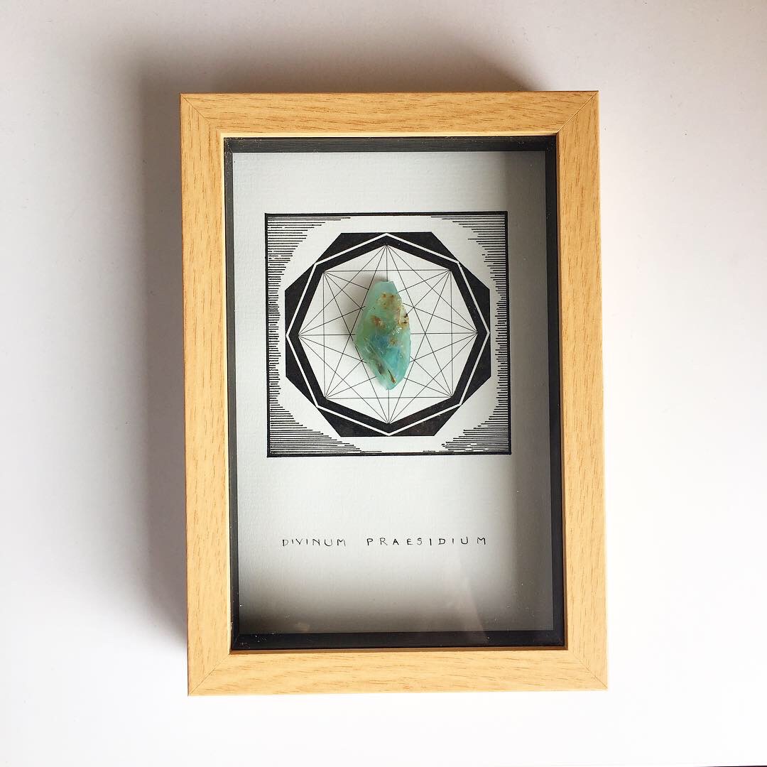 Este Talismán permite volver más perceptible las señales de los seres que viven en divinidad en nuestros espacios y nuestras casas. Permite volver más lúcida y sensible la comunicación y las señales que nos confirman el inmenso e infinito mundo que se construye con Fe. Características: Tamaño del área del dibujo: 13cms. x 9cms. Enmarcación provisoria tamaño 15cms. x 10,5cms. Dibujo a Tinta de 10cms x 7 cms con Cristal de Ópalo Andino. Origen Cuzco, Perú Activado en altar. Incluye envío por correo normal.