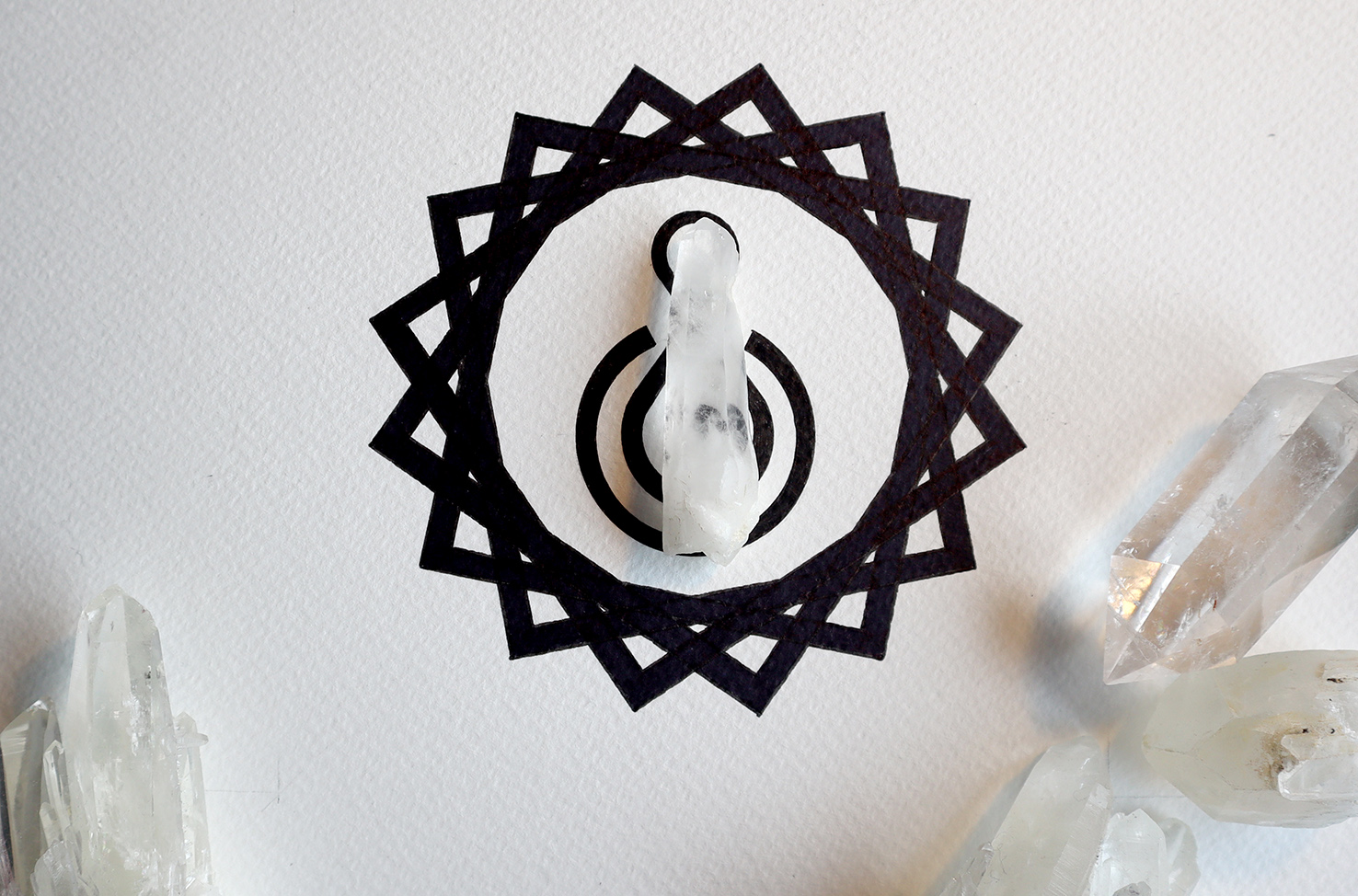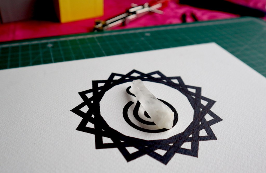 Talismán para poder crear la sutil intención de materializar ideas, proyectos y sentimientos. Dibujo con tinta sobre papel Fabriano de 200grs, tamaño 16cm x 21,5cms Cristal de cuarzo meditado para esta finalidad en el altar de casa. Incluye correo normal a cualquier parte del mundo. No incluye moldura.