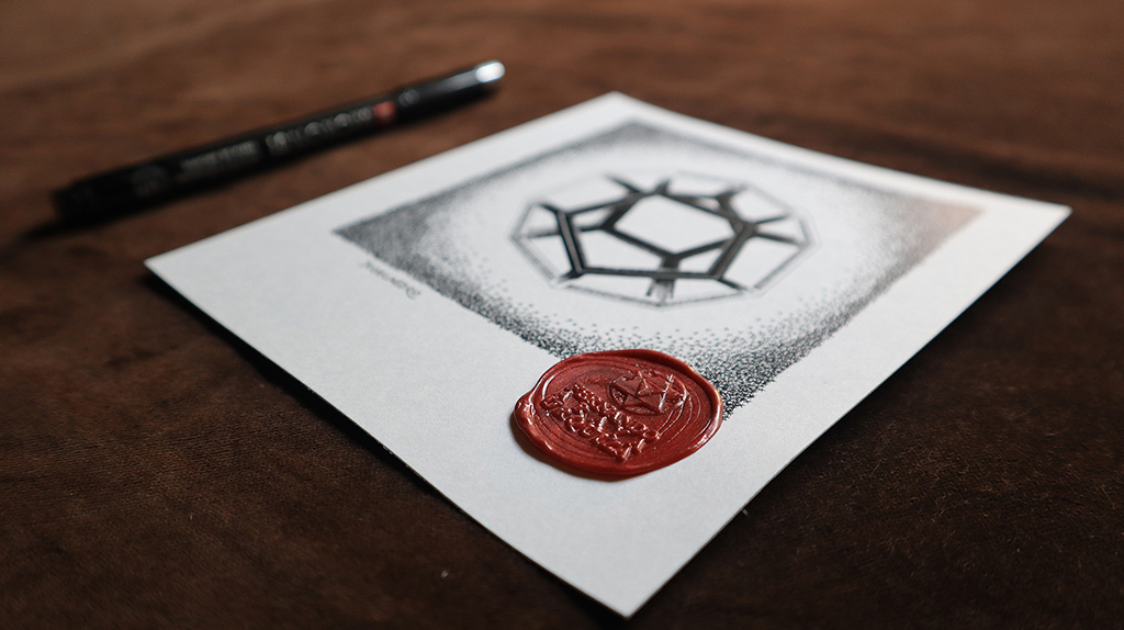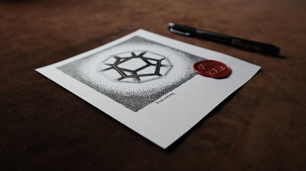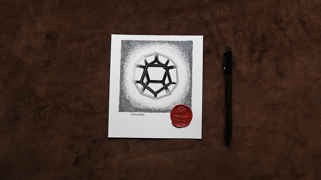 Este año inicié la fabricación de una serie de dibujos acerca de 5 figuras geométricas de gran poder, ya que sus propiedades prácticamente se encuentran en toda la naturaleza, y eso las convierten en Talismanes Puros. Se llaman “Sólidos Platónicos” porque fueron descritos por Platón, y atribuía relaciones con nuestra existencia y nuestra conciencia.